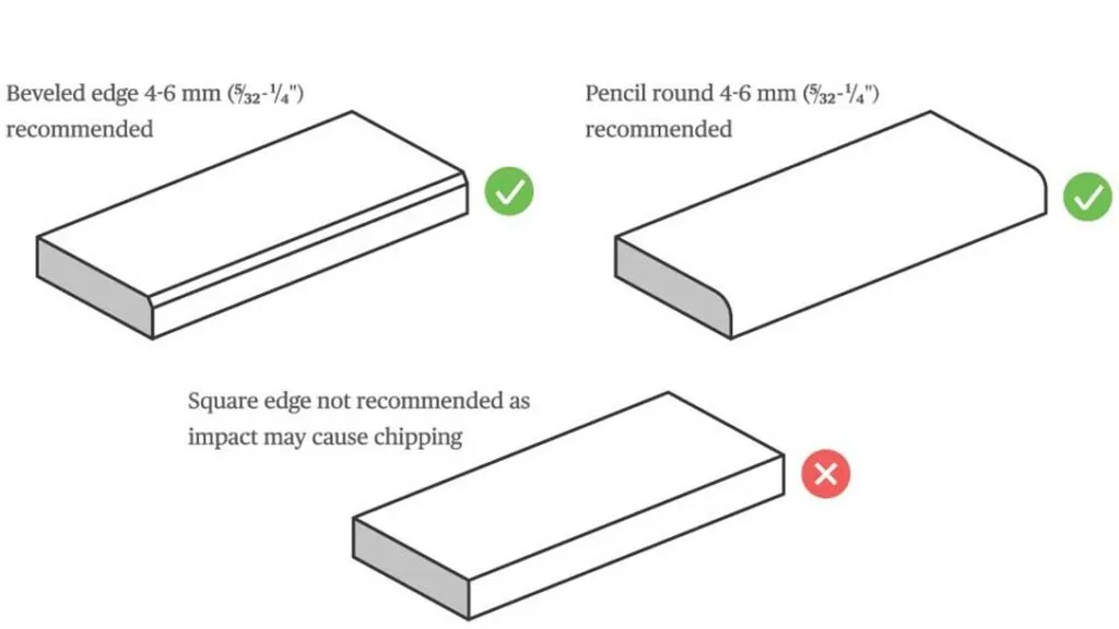 Solution Do not create sharp edge profiles as impact may cause chipping. Edge profiles should be rounded or beveled with a minimum edge profile of 3 mm (1/8″), but preferably 4-6 mm (5/32-1/4”). The larger the surface area of the edge profile, the more resistant it is to chipping.